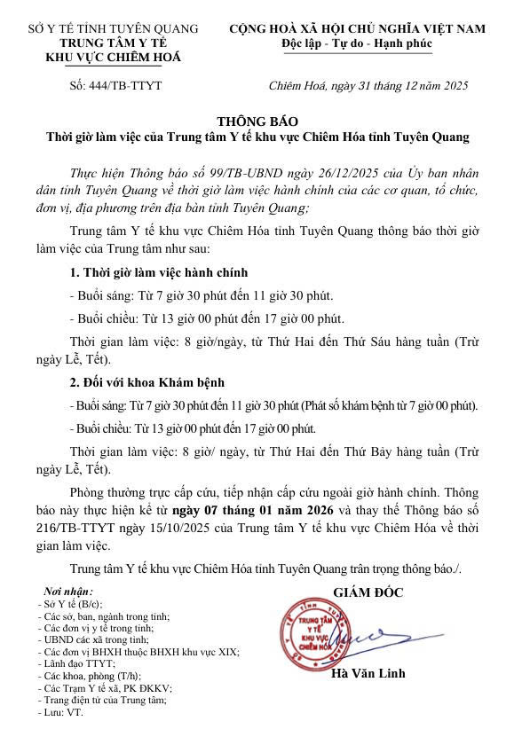 Căn cứ Thông báo của Ủy ban nhân dân tỉnh Tuyên Quang về thời giờ làm việc hành chính trên địa bàn tỉnh; Trung tâm Y tế khu vực Chiêm Hóa thông báo điều chỉnh thời gian làm việc hành chính, áp dụng từ ngày 07/01/2026 như sau: